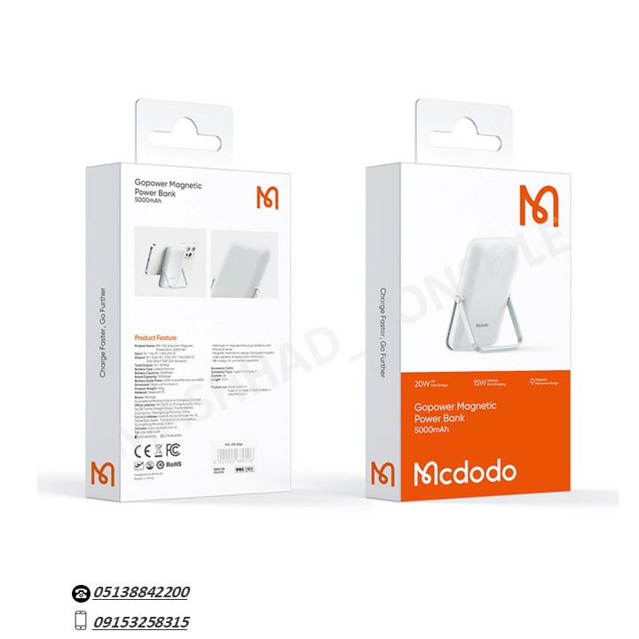 پاوربانک Mcdodo MC-7050 یه شارژ همراه فوق‌العاده سبک و جمع‌وجوره که برای کسانی مناسبه که دست‌شون همیشه به شارژر نرسه — تو سفر، بیرون از خونه، محل کار یا دانشگاه. این مدل با ظرفیت 5000 میلی‌آمپر ساعت و طراحی مگ‌سیف / وایرلس (MagSafe / Wireless) عرضه شده، یعنی اگر گوشی‌ت قابلیت شارژ بی‌سیم داشته باشه، بدون کابل می‌تونیش شارژ کنی؛ خیلی راحت و بدون دردسر.